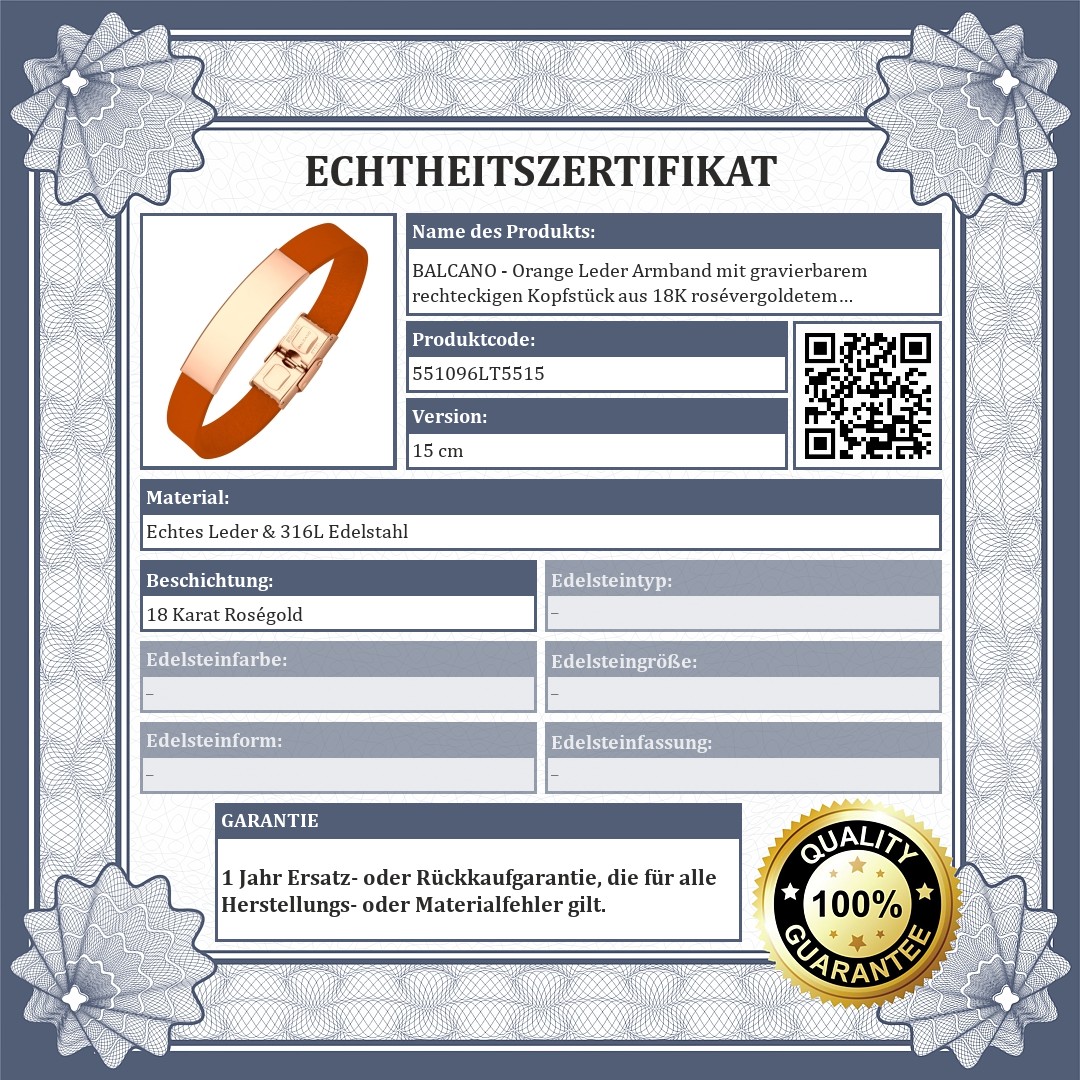 BALCANO - Orange Leder Armband mit gravierbarem rechteckigen Kopfstück aus 18K rosévergoldetem Edelstahl