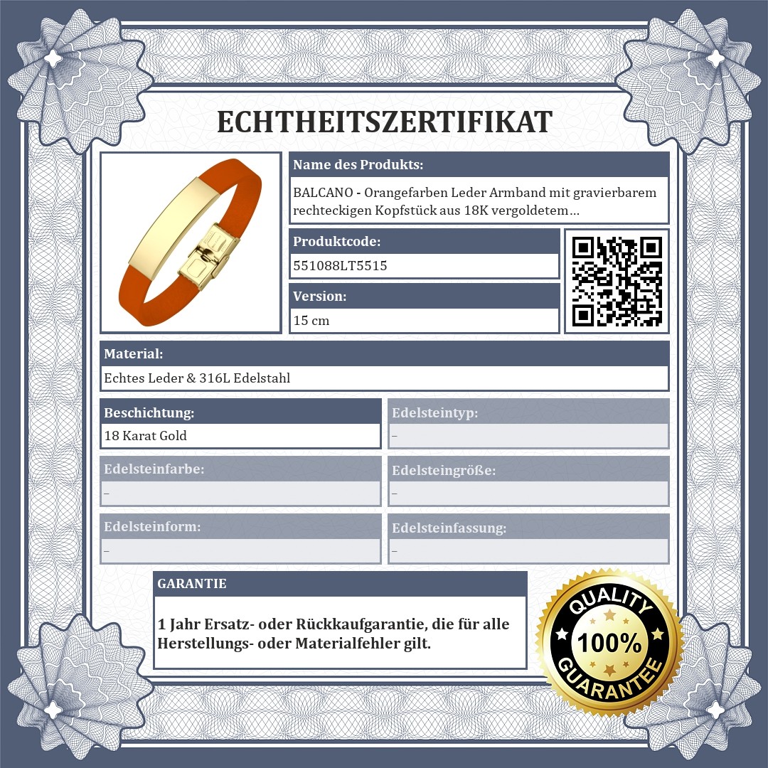 BALCANO - Orangefarben Leder Armband mit gravierbarem rechteckigen Kopfstück aus 18K vergoldetem Edelstahl