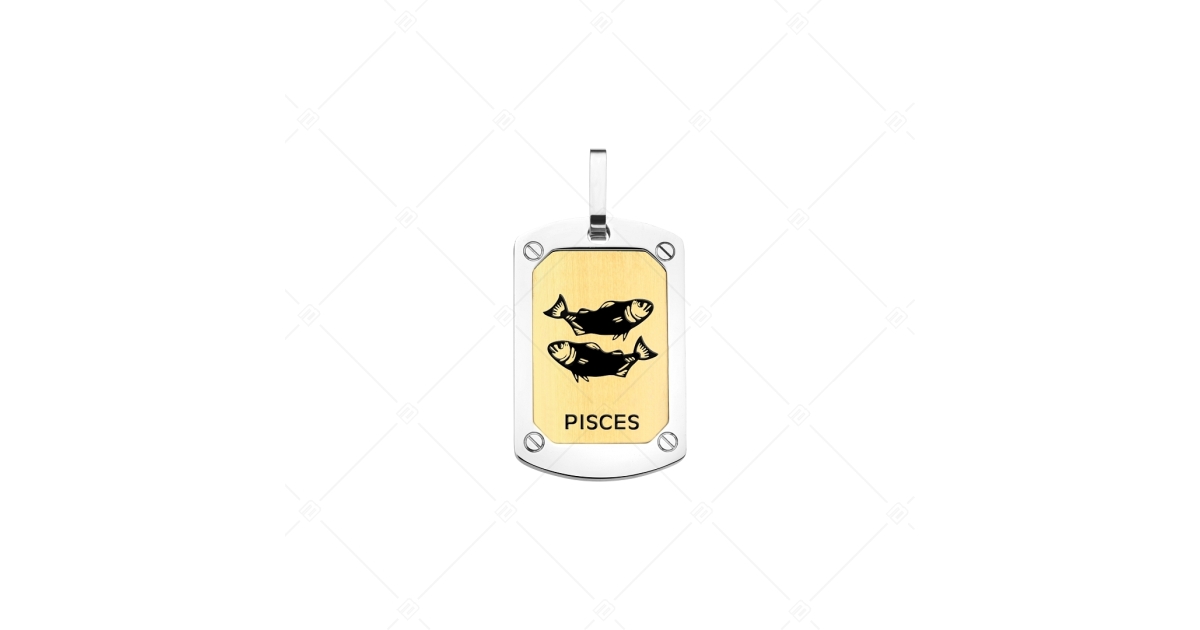 Antiallergischer, rechteckiger horoskop Anhänger von Edelstahl mit dem bild des sternzeichens Fische. Schmuck aus medizinischem 316L-Edelstahl, der aufgrund seines materials extrem langlebig ist. Hochglanzpolierte, 18K vergoldete, matte oberfläche mit eingravierten und gemalten sternzeichen symbolen.