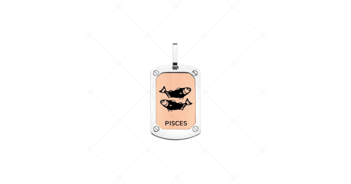 Antiallergischer, Edelstahl, rechteckige horoskop Anhänger mit dem bild des sternzeichens Fische. Schmuck aus medizinischem 316L-Edelstahl, der aufgrund seines materials extrem langlebig ist. Hochglanzpolierte, 18K rosévergoldete, matte gewinde oberfläche mit eingraviertem und gemaltem sternzeichen symbol.