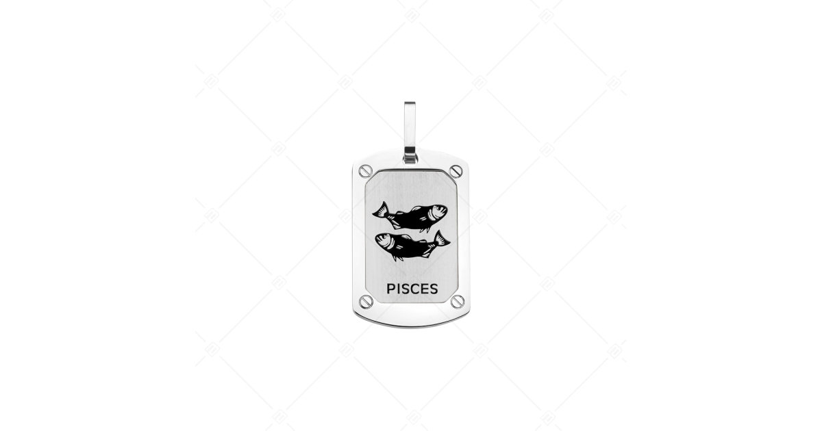 Antiallergischer, rechteckiger horoskop Anhänger von Edelstahl mit dem bild des sternzeichens Fische. Schmuck aus medizinischem 316L-Edelstahl, der aufgrund seines materials extrem langlebig ist. Hochglanzpoliert ,In der mitte der matten, mit einem gewinde versehenen oberfläche sind die symbole der sternzeichen eingraviert und gemalt.