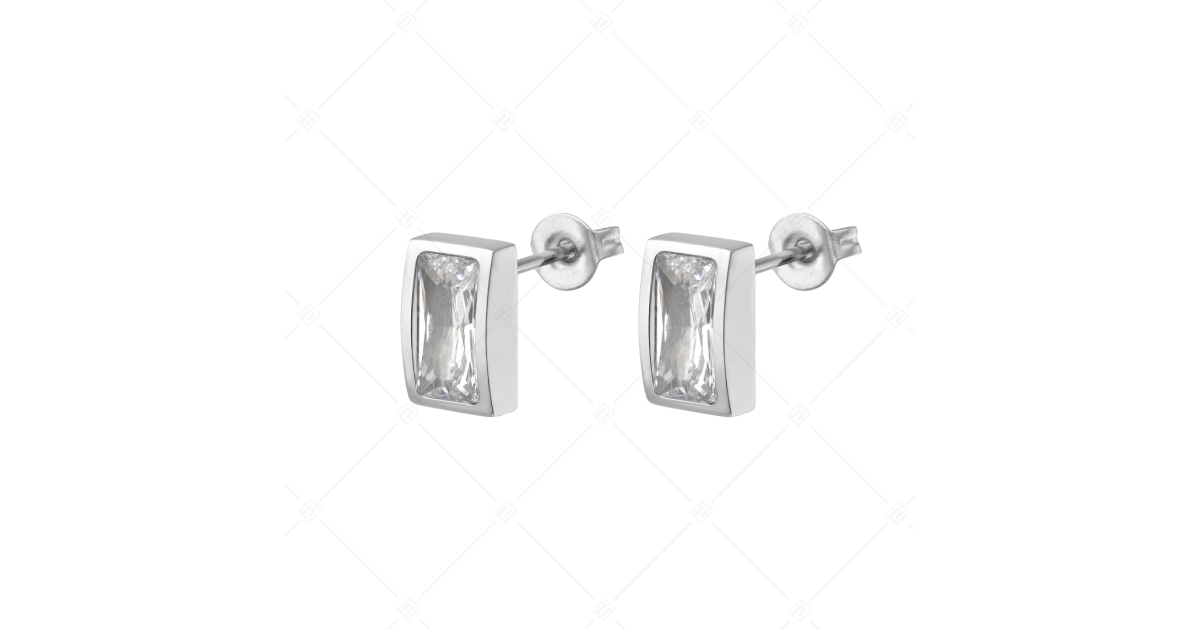 Einzigartige Ohrstecker mit kubischen Zirkonia im Baguette-Schliff in Kessel Fassung. Hochwertiger antiallergischer medizinischer 316L-Edelstahl Schmuck mit Hochglanzpolierung. Dank seines besonderen Designs kann es ein wirklich stilvolles und modisches Zubehör sein.