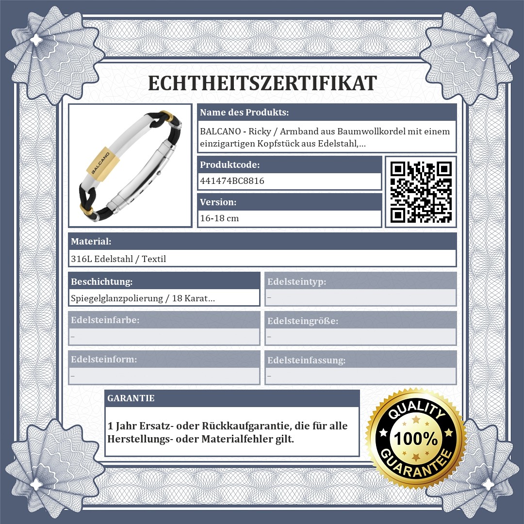 BALCANO - Ricky / Armband aus Baumwollkordel mit einem einzigartigen Kopfstück aus Edelstahl, 18K vergoldet