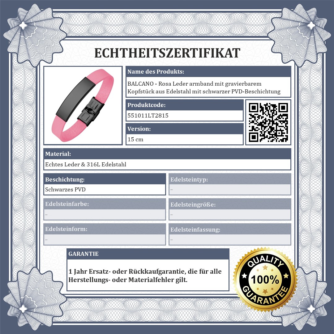 BALCANO - Rosa Leder armband mit gravierbarem Kopfstück aus Edelstahl mit schwarzer PVD-Beschichtung