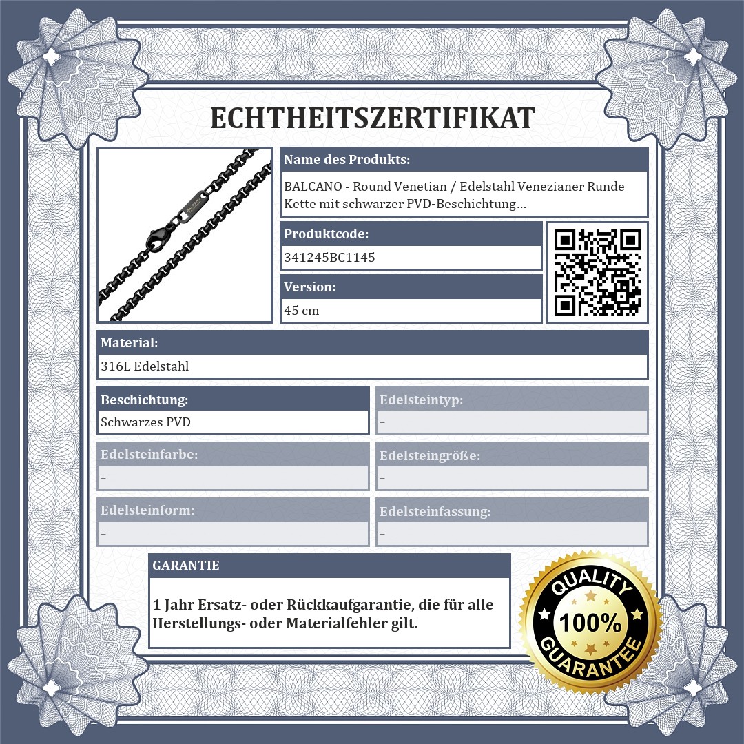 Hochwertige, antiallergische, Venezianer Rund Kette von 316L-Edelstahl, schwarzer Chrom-PVD-beschichtet. Dank ihres materials nutzt sie sich nicht ab, rostet nicht, läuft während des gebrauchs nicht an.