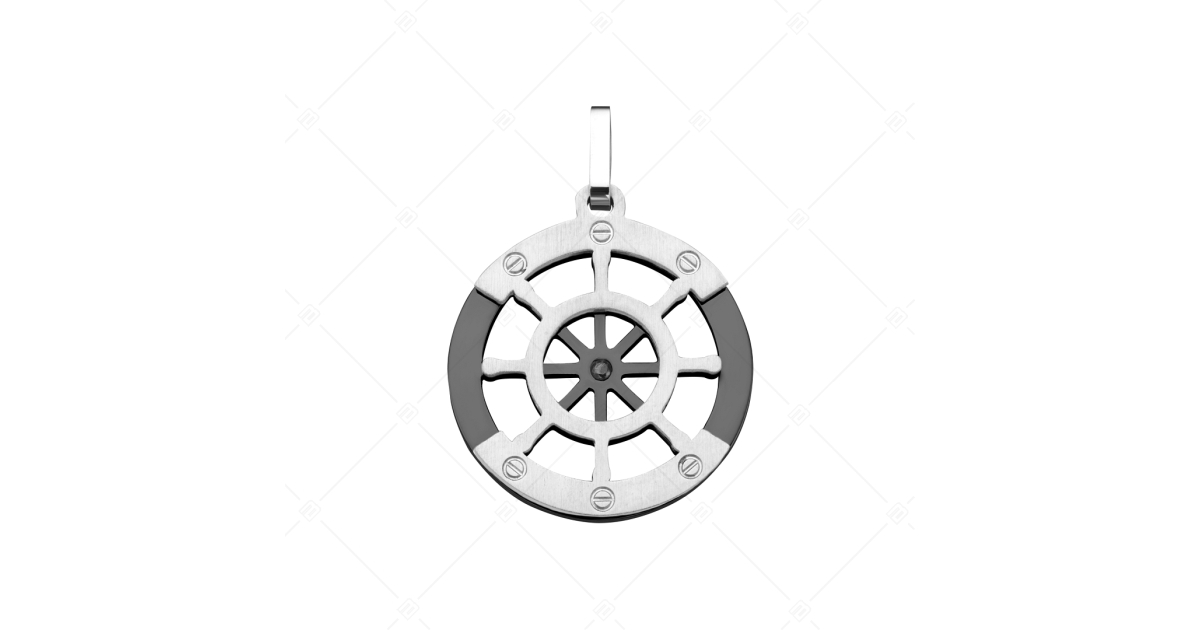 Stilvolles Zubehör für wasserliebhaber. Lenkrad Anhänger bestehend aus zwei elementen. Der obere teil ist silberfarben, matt, der untere teil ist schwarz PVD beschichtet. Medizinischer, antiallergener 316L-Edelstahl Schmuck.