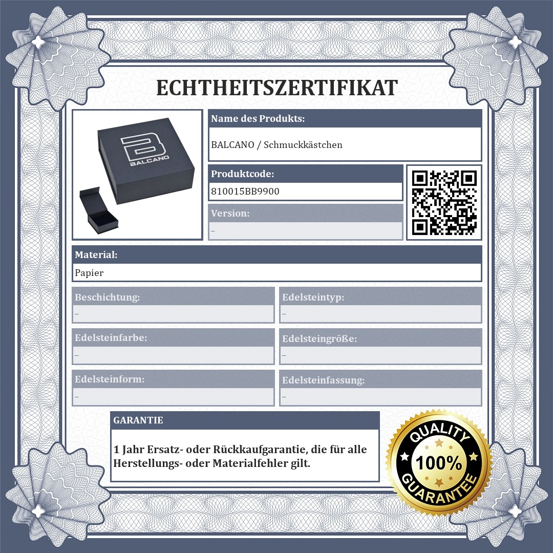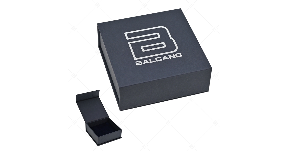 Hochwertiges Magnetverschluss-Schmuckkästchen mit silbernem BALCANO-Logo auf dem Deckel und grauem Schwammeinsatz mit marineblauem Samtbezug. Innenmaße 92 x 92 mm. Es eignet sich für die sichere und ästhetische Aufbewahrung von Armbändern, Halsketten und anderem größeren Schmuck. Erhältlich als eigenständige Geschenkschachtel oder mit individueller Geschenkverpackung.