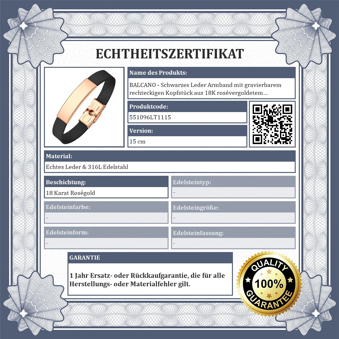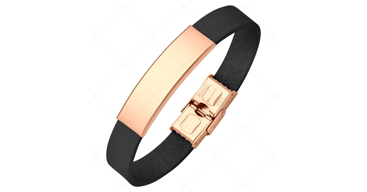 BALCANO - Schwarzes Leder Armband mit gravierbarem rechteckigen Kopfstück aus 18K rosévergoldetem Edelstahl