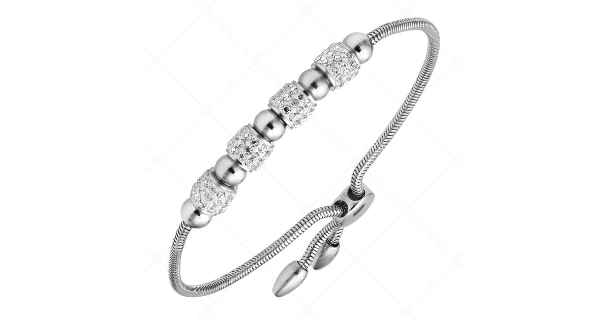 Größenverstellbares Schlangenketten-Armband mit schönen Zylindern und Kugeln, verziert mit glänzenden tschechischen Kristallen. Das Armband ist aus medizinischem 316L-Edelstahl gefertigt, der antiallergisch und sehr widerstandsfähig ist. Ein sehr bequemer und modischer Schmuck.