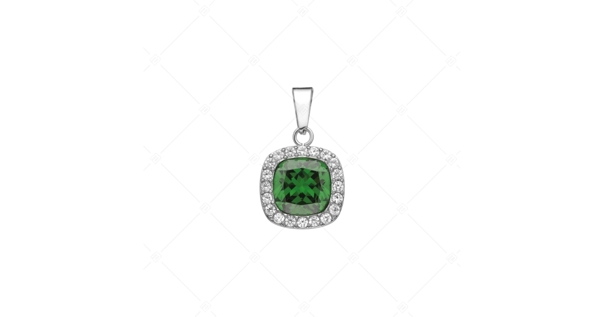 Eleganter, quadratischer Anhänger mit Zirkonia Edelsteinen. Antiallergischer, hochglanzpolierter 316L-Edelstahl Schmuck. Ein größerer quadratischer grün stein in der mitte ist von einem kreis glänzender, klarer, kleinerer runder Zirkonia steine umgeben, die das schmuckstück noch mehr funkeln lassen.