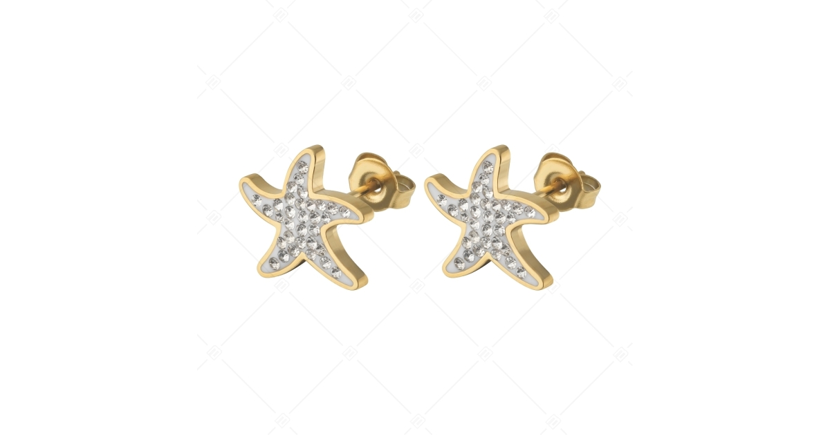 Trendige Ohrstecker in Form eines fröhlichen Seesterns. Hergestellt aus 18K vergoldetem, antiallergischem medizinischer 316L-Edelstahl Schmuck. Ein hochwertiges Zubehör mit glänzenden, klaren tschechischen Kristallen.