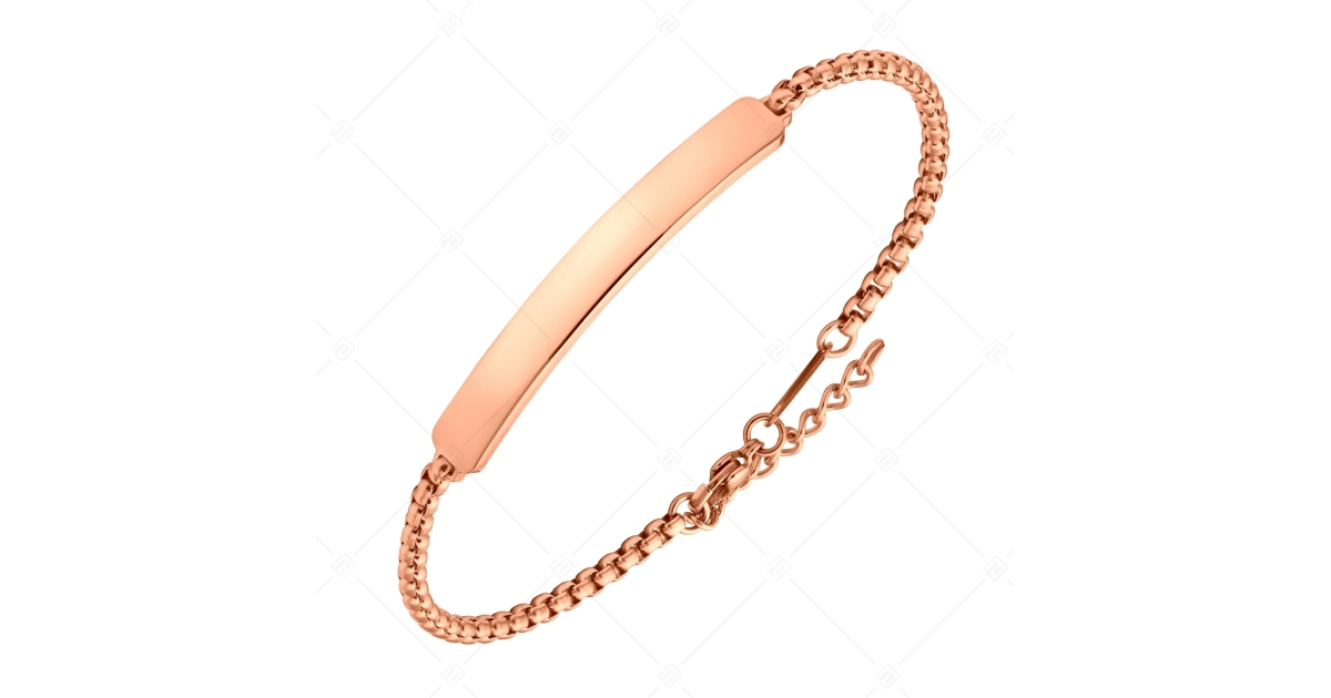 Beeindruckendes, Runde venezianisches Würfelketten-Armband mit gravierbarem rechteckigem Kopfstück. Schmuck aus medizinischem, und antiallergischem 316L-Edelstahl, mit 18K rosévergoldet.