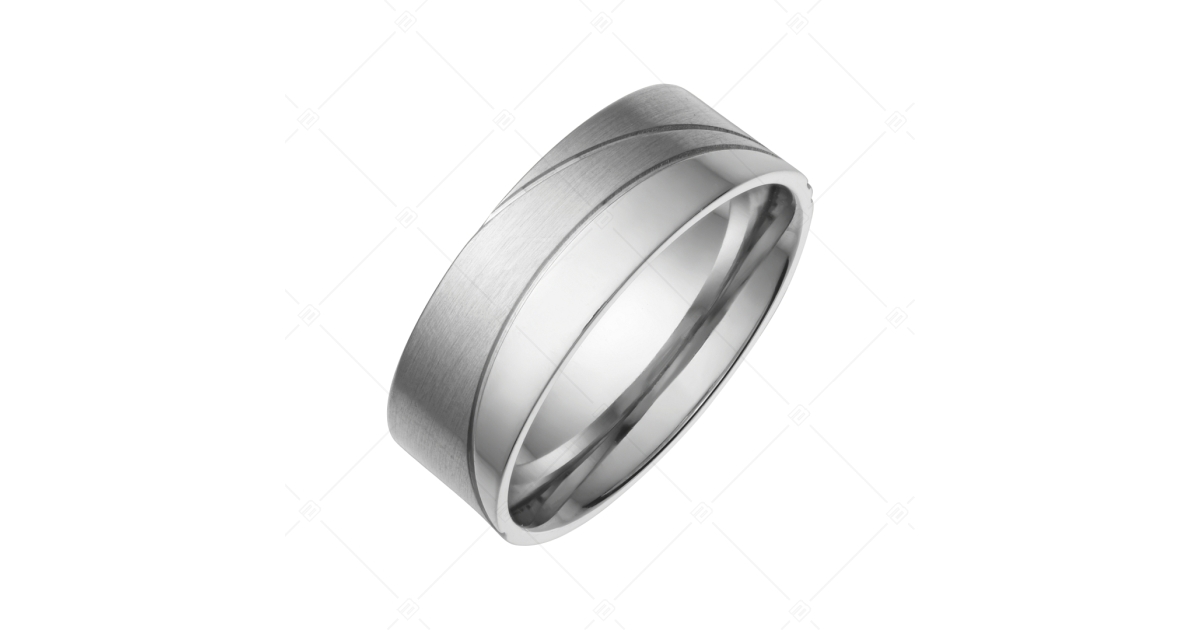 Ehering aus antiallergischem 316L-Edelstahl mit geschwungenen Linien, die den polierten Teil vom matten Teil mit gebürsteter Oberfläche trennen. Elegantes Schmuckstück mit einem glänzenden Design.