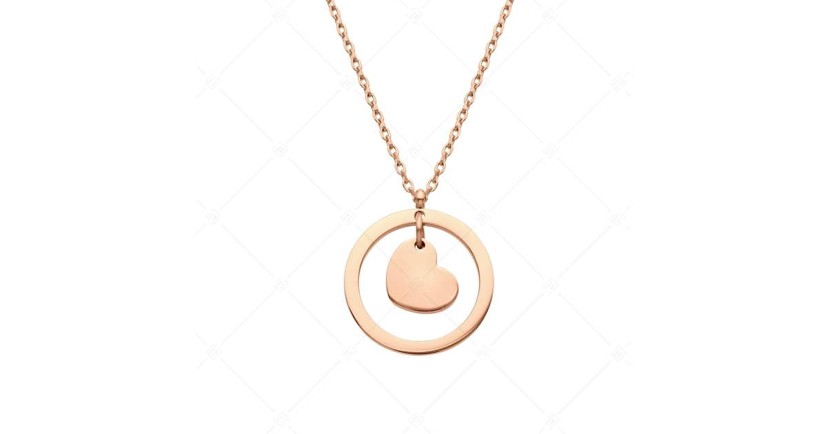 Hübscher runder Anhänger, verziert mit einem hängenden Herz. Flache Ankerkette. Hergestellt aus hochwertigem medizinischem 316L-Edelstahl. Mit sicherem delphinverschluss, 18K Roségoldbeschichtung.