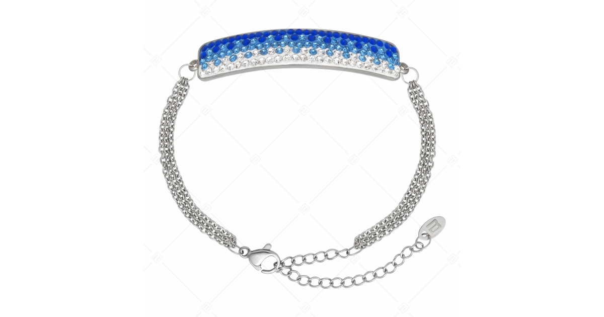 Antiallergischer, hochglanzpolierter Schmuck von 316L- Edelstahl. Größenverstellbares Armband mit delphinverschluss aus drei Reihen von flachen Ankerketten. Modischer geschwungener Kopfschmuck, besetzt mit hochglänzenden wasserklaren und blauen tschechischen Kristallen.