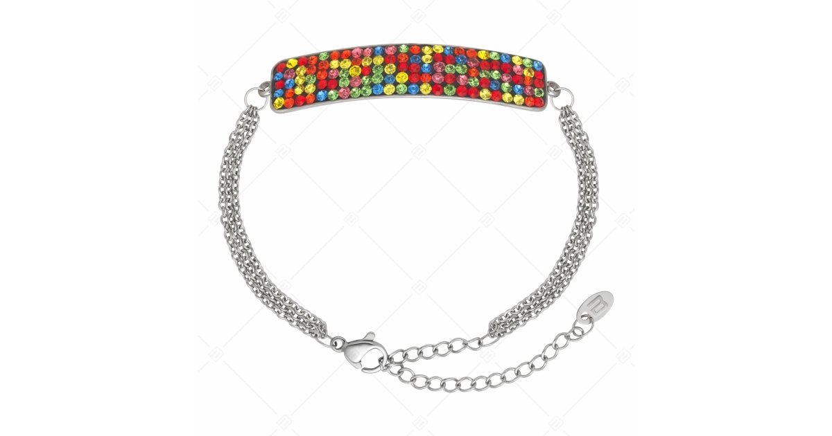 Antiallergischer, hochglanzpolierter Schmuck von 316L-Edelstahl. Größenverstellbares Armband mit delphinverschluss aus drei Reihen von flachen Ankerketten. Modischer, geschwungener Kopfschmuck, besetzt mit hochglänzenden, mehrfarbigen tschechischen Kristallen.