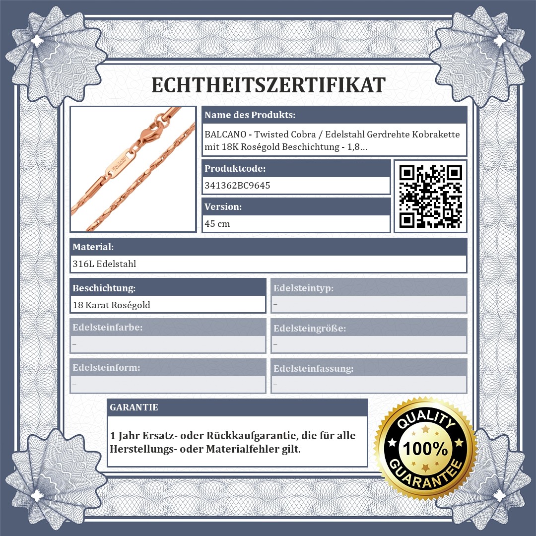 BALCANO - Twisted Cobra / Edelstahl Gerdrehte Kobrakette mit 18K Roségold Beschichtung - 1,8 mm