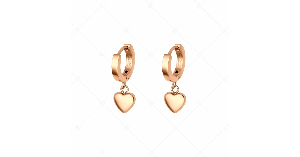 Modische Band Ohrringe, verziert mit einem kleinen Herz. Schmuck aus medizinischem 316L-Edelstahl mit 18K Roségold Beschichtung. Dank seines hochwertigen Materials färbt und nutzt es sich nicht ab.