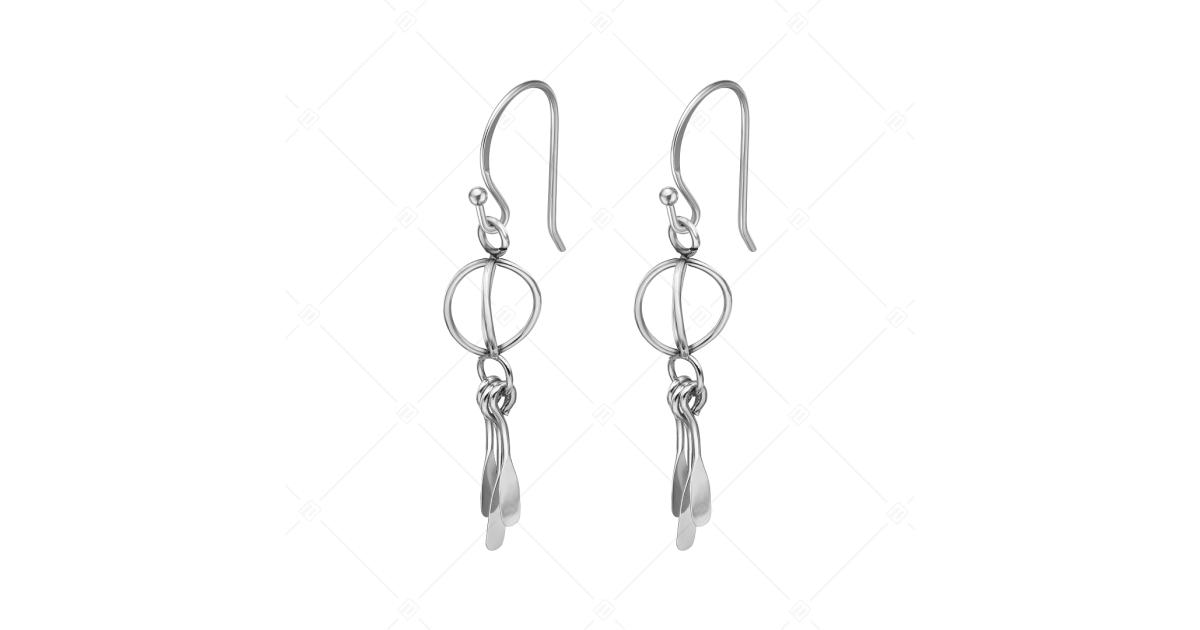 Kleine gedrehte, gebogene, kugelförmige Ohrringe aus 316L-Edelstahl mit kleinen baumelnden, zungenförmigen Verzierungen, mit Hochglanzpolierung. Allergiefreies Schmuckstück, so dass jeder es sicher tragen kann. Dank seines Materials verfärbt er sich nicht, nutzt sich nicht ab und ist unempfindlich gegenüber Heilwasser und Reinigungsmitteln. Einzigartig und elegant für jeden Anlasse.