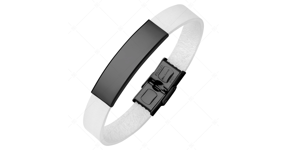 BALCANO - Weißes Leder armband mit gravierbarem Kopfstück aus Edelstahl mit schwarzer PVD-Beschichtung