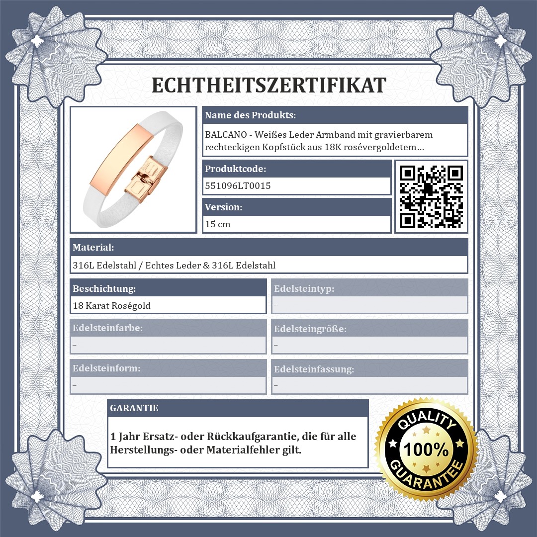 BALCANO - Weißes Leder Armband mit gravierbarem rechteckigen Kopfstück aus 18K rosévergoldetem Edelstahl