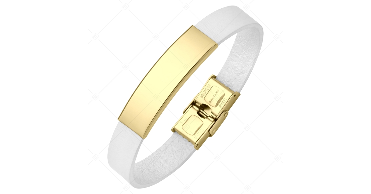 BALCANO - Weißes Leder Armband mit gravierbarem rechteckigen Kopfstück aus 18K vergoldetem Edelstahl