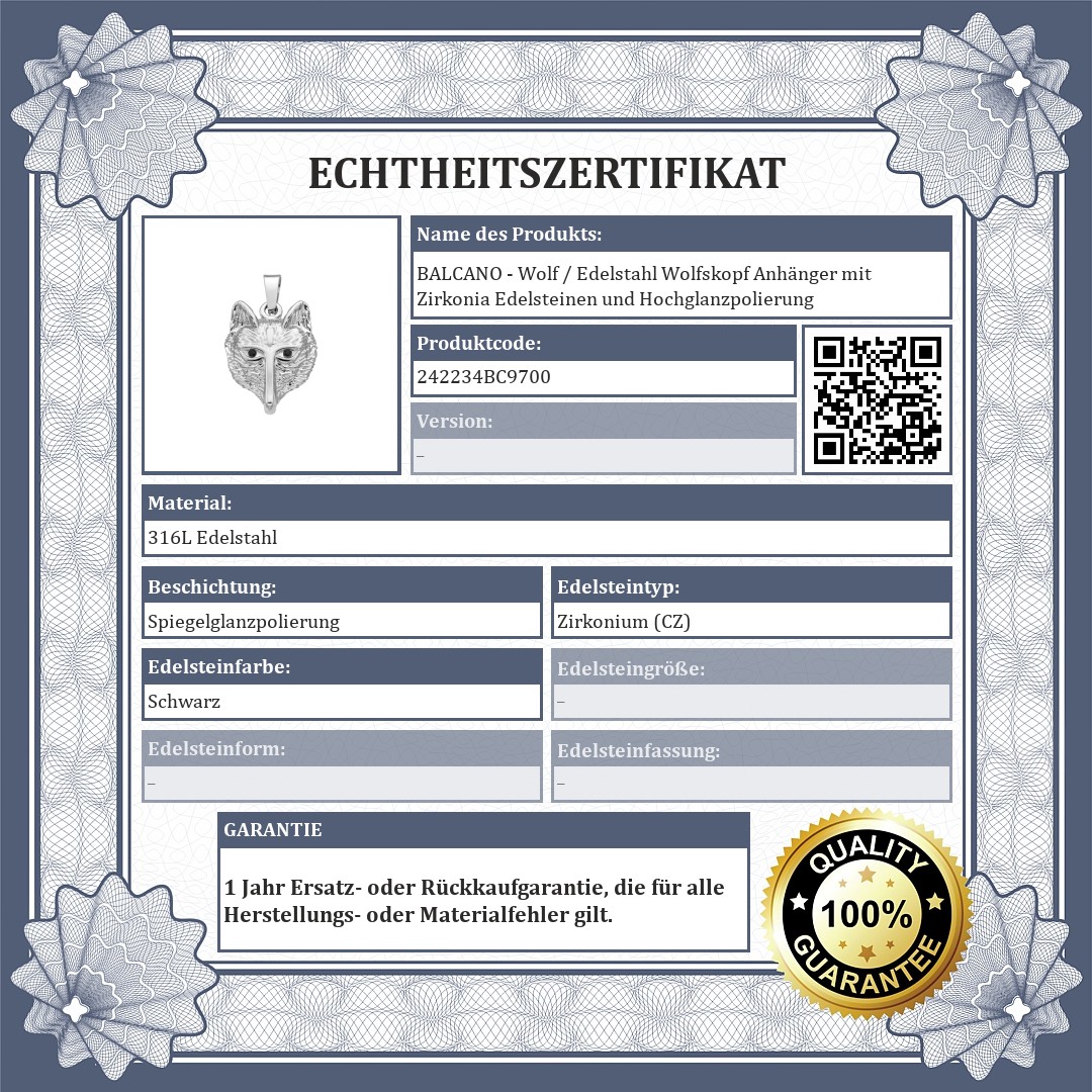 BALCANO - Wolf / Edelstahl Wolfskopf Anhänger mit Zirkonia Edelsteinen und Hochglanzpolierung