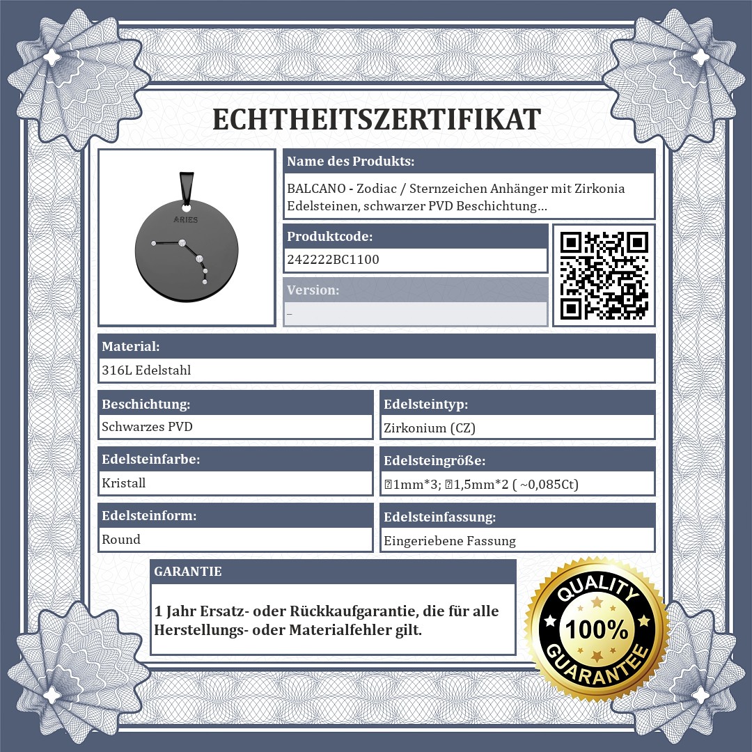 BALCANO - Zodiac / Sternzeichen Anhänger mit Zirkonia Edelsteinen, schwarzer PVD Beschichtung - Widder