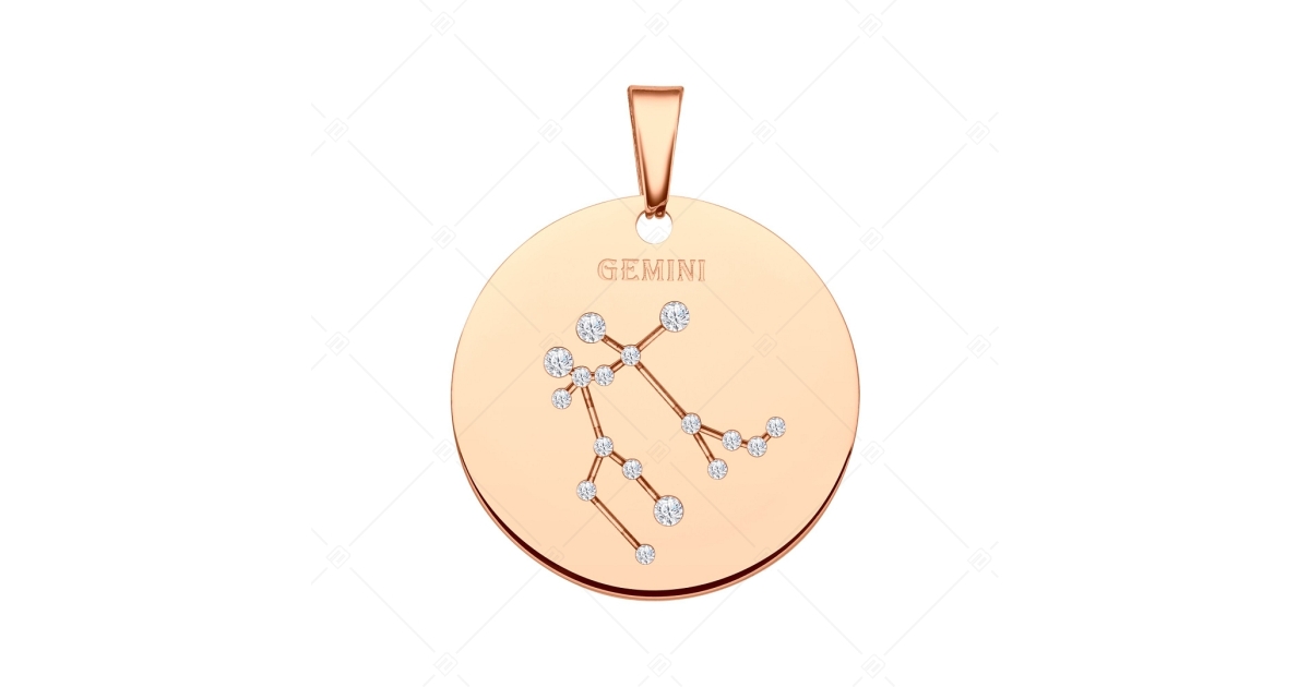 Anhänger verziert mit dem sternbild der Zwillinge. Zubehör aus medizinischem 316L-Edelstahl, mit 18K Roségold Beschichtung. Das sternbild ist in ein muster eingraviert, das mit funkelnden Zirkoniasteinen als winzige helle sternchen verziert ist.
