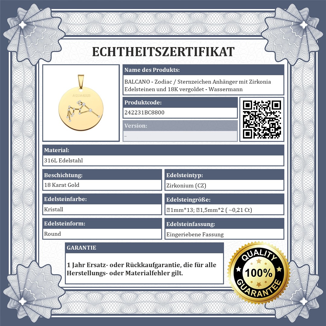 BALCANO - Zodiac / Sternzeichen Anhänger mit Zirkonia Edelsteinen und 18K vergoldet - Wassermann