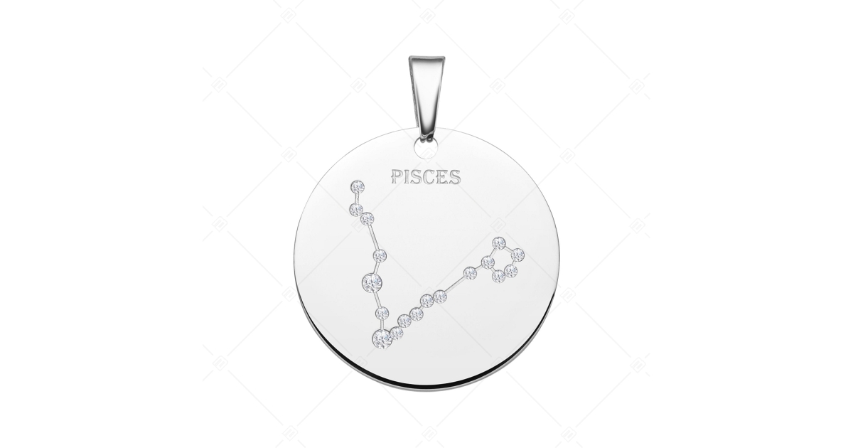 Anhänger verziert mit sternbild des Fisches. Zubehör aus medizinischem 316L-Edelstahl mit hochglanzpolierter oberfläche. Das sternbild ist in ein muster eingraviert, das mit funkelnden Zirkoniasteinen als winzige helle sternchen verziert ist.
