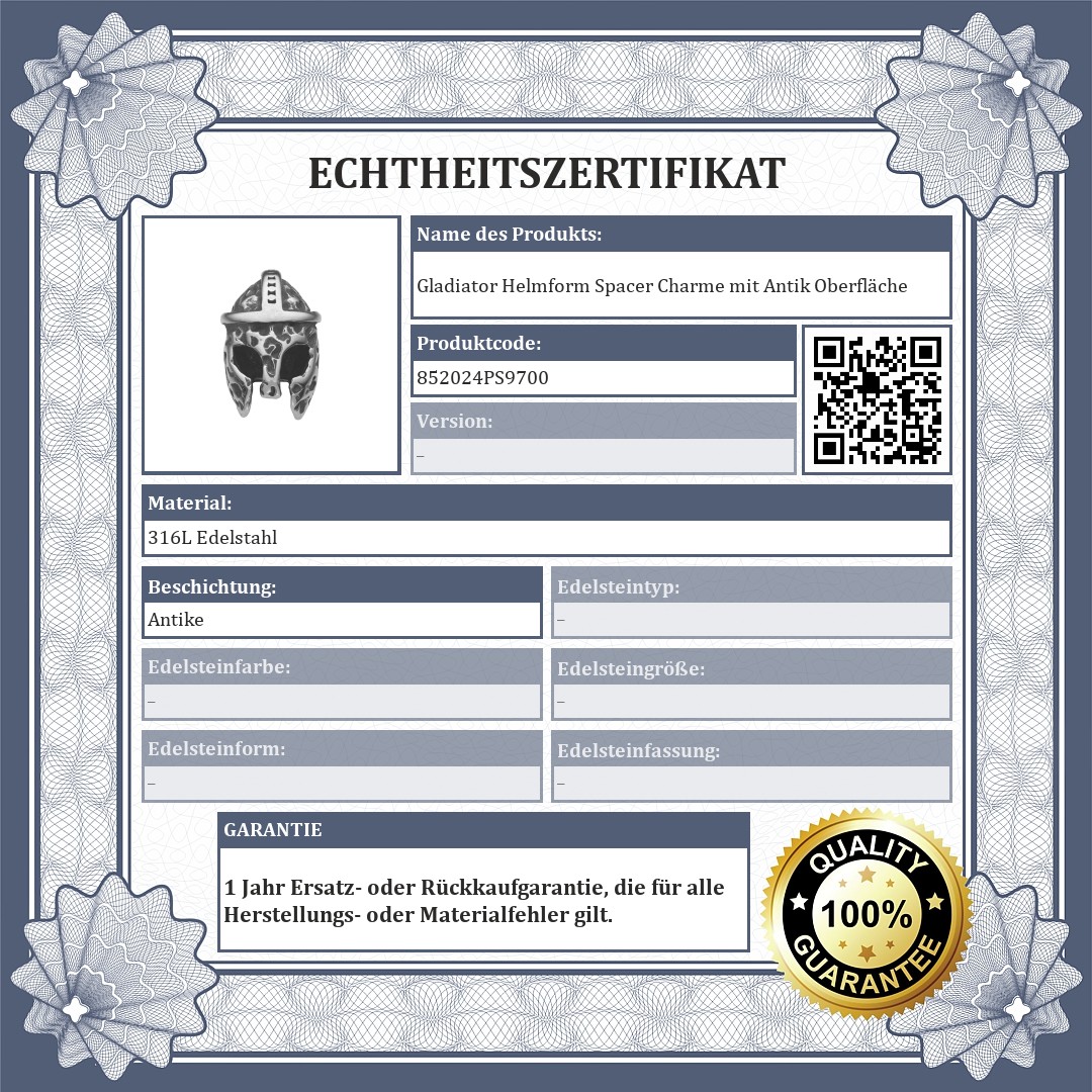 Gladiatorenhelm in Form eines Spacer Charme. Die Oberfläche dieses Zubehör aus medizinischem 316L-Edelstahl hat einen speziellen Antik-Effekt. Spacer sorgen dafür, dass Charmes und Perlen nicht von Ihrem Armband abrutschen.