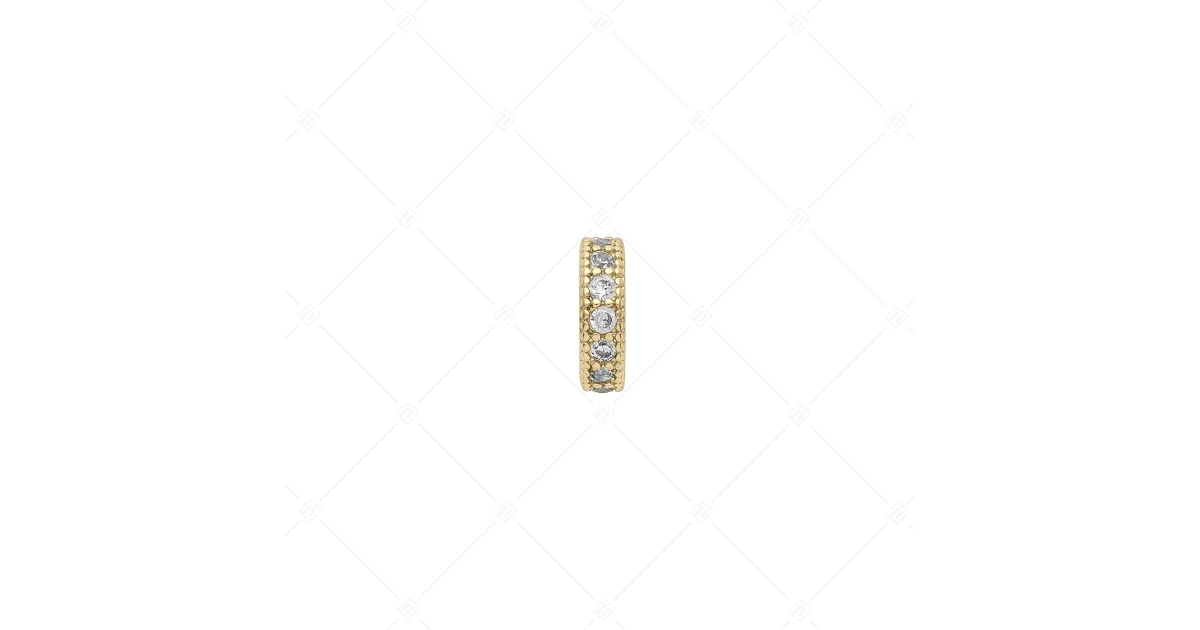 Ein runder klarer Zirkonia Edelstein besetzt mit einem sogenannten Spacer Charme. Zubehör aus 18K vergoldetem Kupfer. Die Abstandshalter sorgen dafür, dass Ihre Charmes und Perlen nicht auf dem Armband verrutschen.
