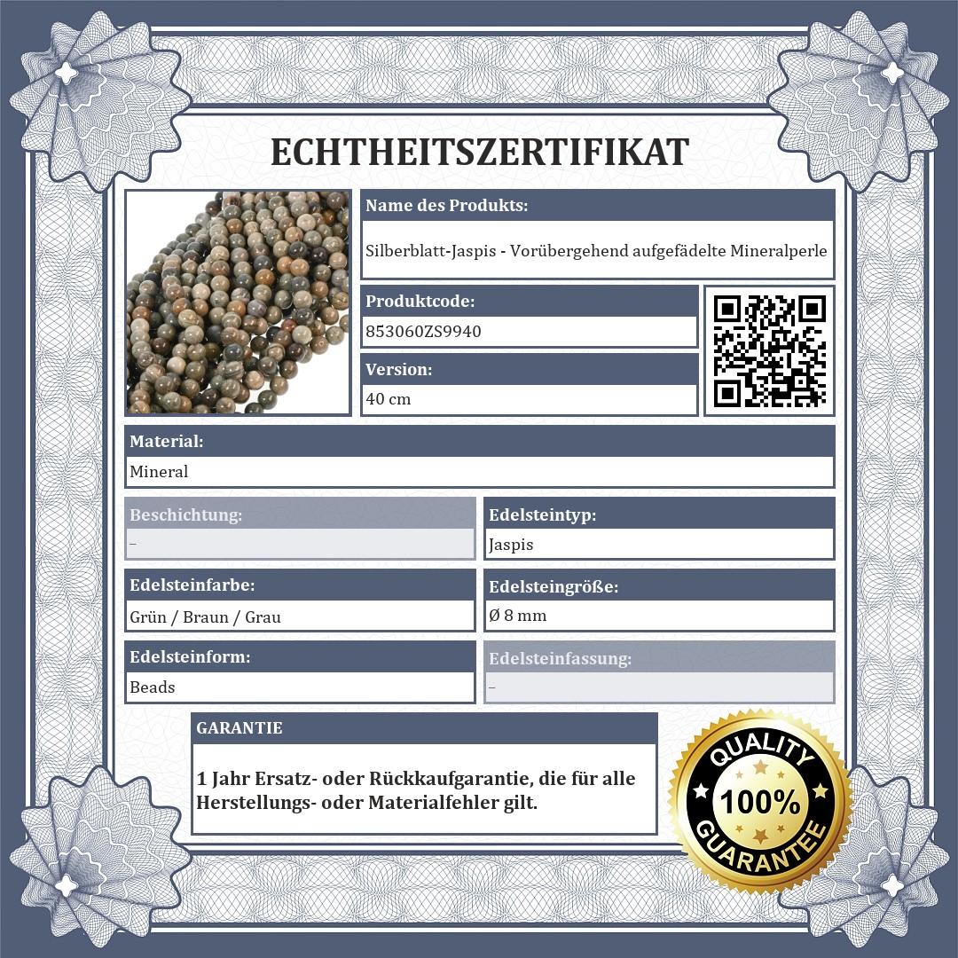 Silberblatt-Jaspis - Vorübergehend aufgefädelte Mineralperle