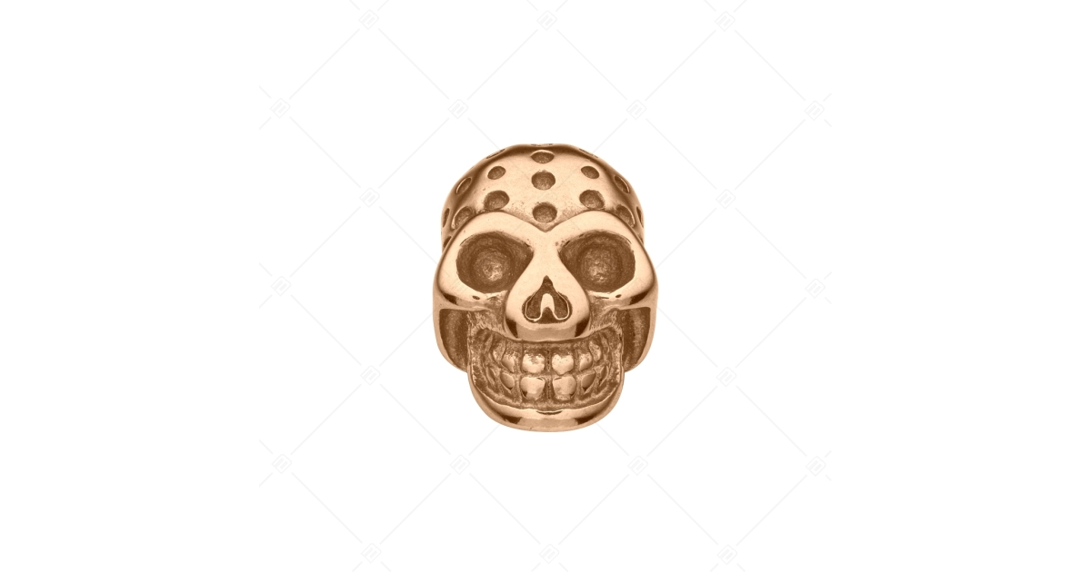 Totenkopf form Soacer Charme mit vertiefter Oberfläche. Zubehör aus medizinischem 316L-Edelstahl, 18K rosévergoldet. Die Spacer sorgen dafür, dass die Charmes und Perlen nicht auf Ihrem Armband verrutschen.