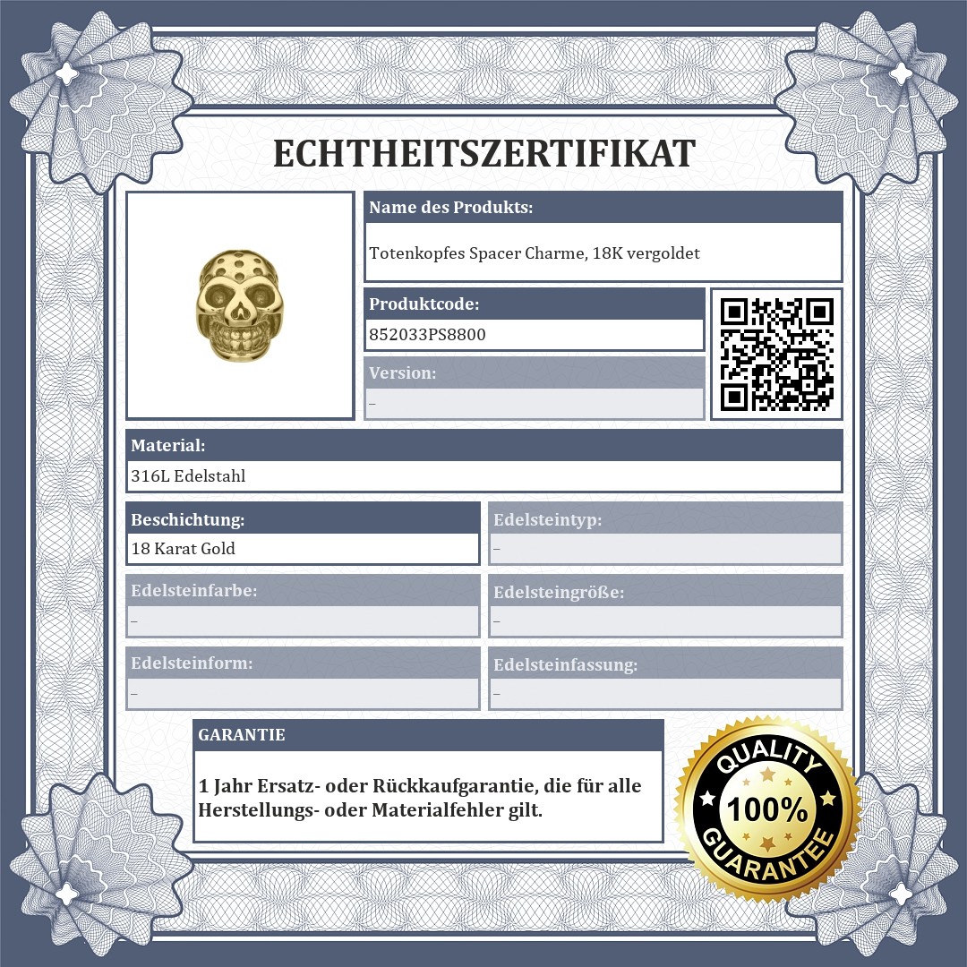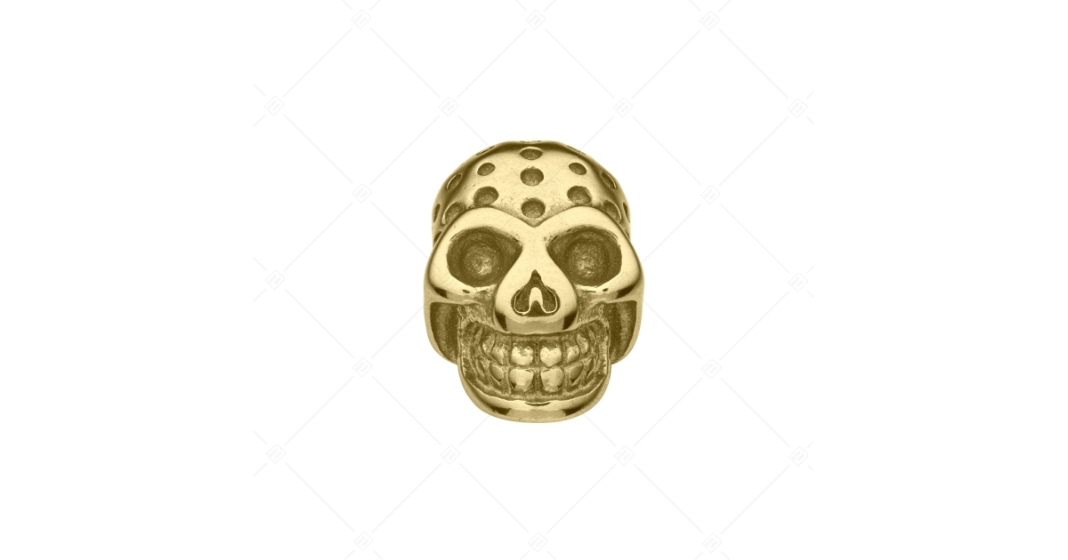 Totenkopf form Soacer Charme mit vertiefter Oberfläche. Zubehör aus medizinischem 316L-Edelstahl, 18K vergoldet. Die Spacer sorgen dafür, dass die Charmes und Perlen nicht auf Ihrem Armband verrutschen.