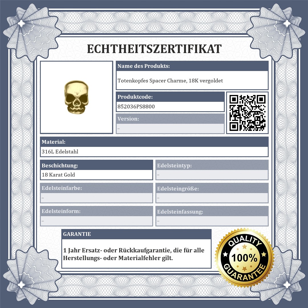Totenkopfes form Spacer Charme. Zubehör aus medizinischem 316L-Edelstahl, 18K vergoldet. Die Spacer sorgen dafür, dass die Charmes und Perlen nicht von Ihrem Armband abrutschen.