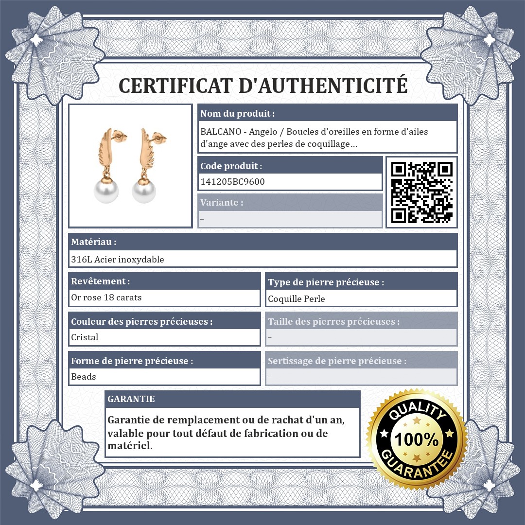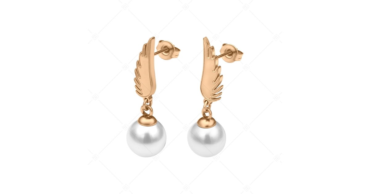De charmantes boucles d'oreilles en forme d'ailes d'ange ornées d'une perle de coquillage blanche. Bijoux en acier inoxydable médical 316L avec plaqué or rose 18K. Grâce à son matériau de haute qualité, il ne se décolorera pas et ne s'usera pas.