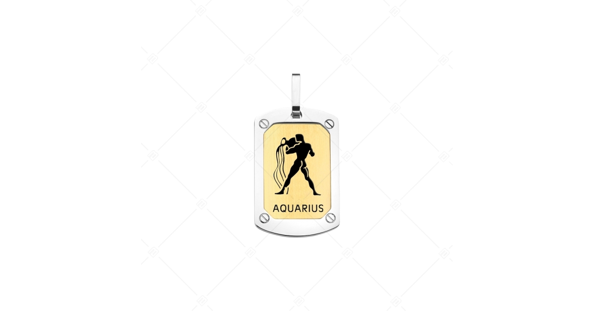 Pendentif horoscope rectangulaire en acier inoxydable, antiallergique, avec l'image du signe zodiaque Verseau. Les bijoux en acier inoxydable médical 316L sont extrêmement durables grâce à leur matériau. Surface filetée, polie, plaqué or 18K, avec le symbole des signes du zodiaque gravé et peint.