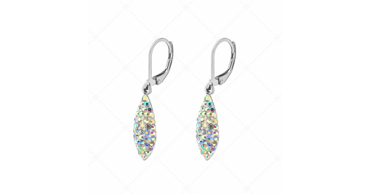 Boucles d'oreilles étincelantes pendantes en forme de flocon d'avoine, serties de cristaux tchèques jouant avec les couleurs et la lumière. Bijoux en acier inoxydable de qualité médicale 316L, extrêmement durable, qui ne s'use pas et ne se décolore pas.