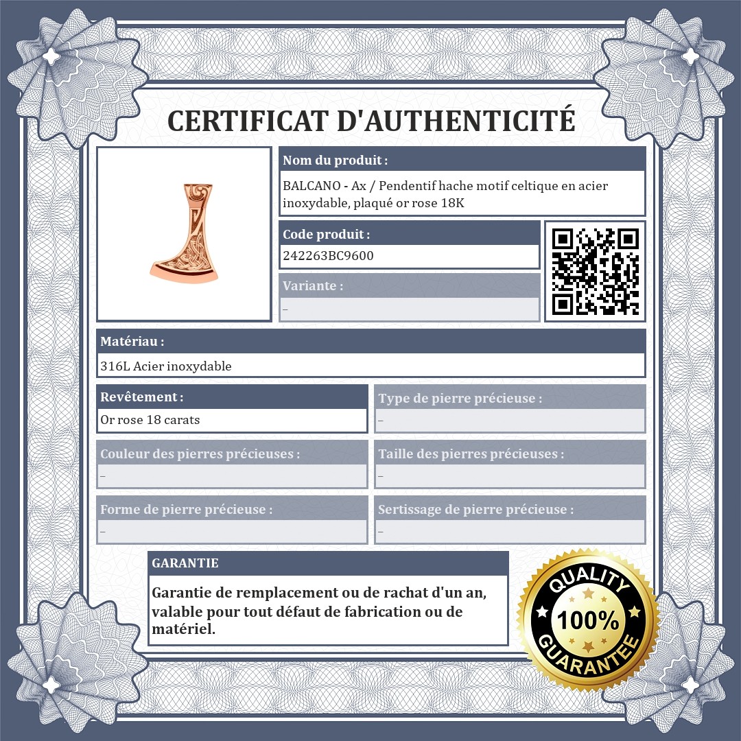 BALCANO - Ax / Pendentif hache motif celtique en acier inoxydable, plaqué or rose 18K
