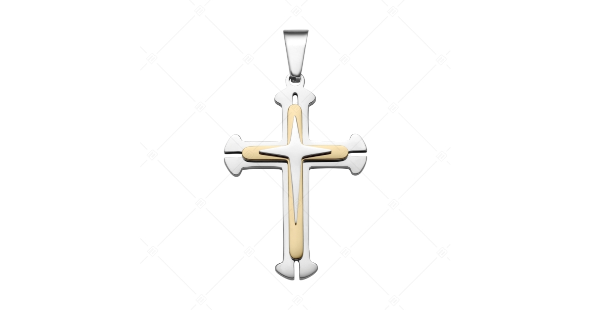 Pendentif en forme de croix en acier inoxydable 316L de qualité médicale, travail de qualité, argenté, combiné avec de l'or 18K. Avec hautement polie, grâce à son matériau il est extrêmement durable. Le pendentif est également disponible dans un ensemble avec plusieurs chaînes BALCANO dans notre boutique en ligne.