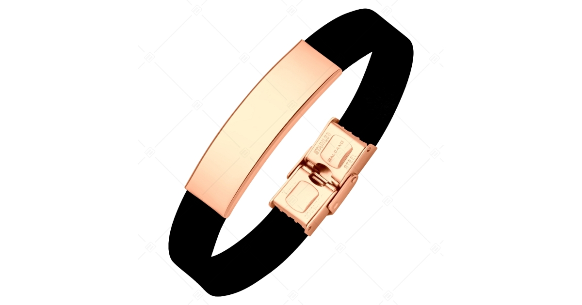 BALCANO - Bracelet en caoutchouc noir avec tête rectangulaire gravable en acier inoxydable plaqué or rose 18K