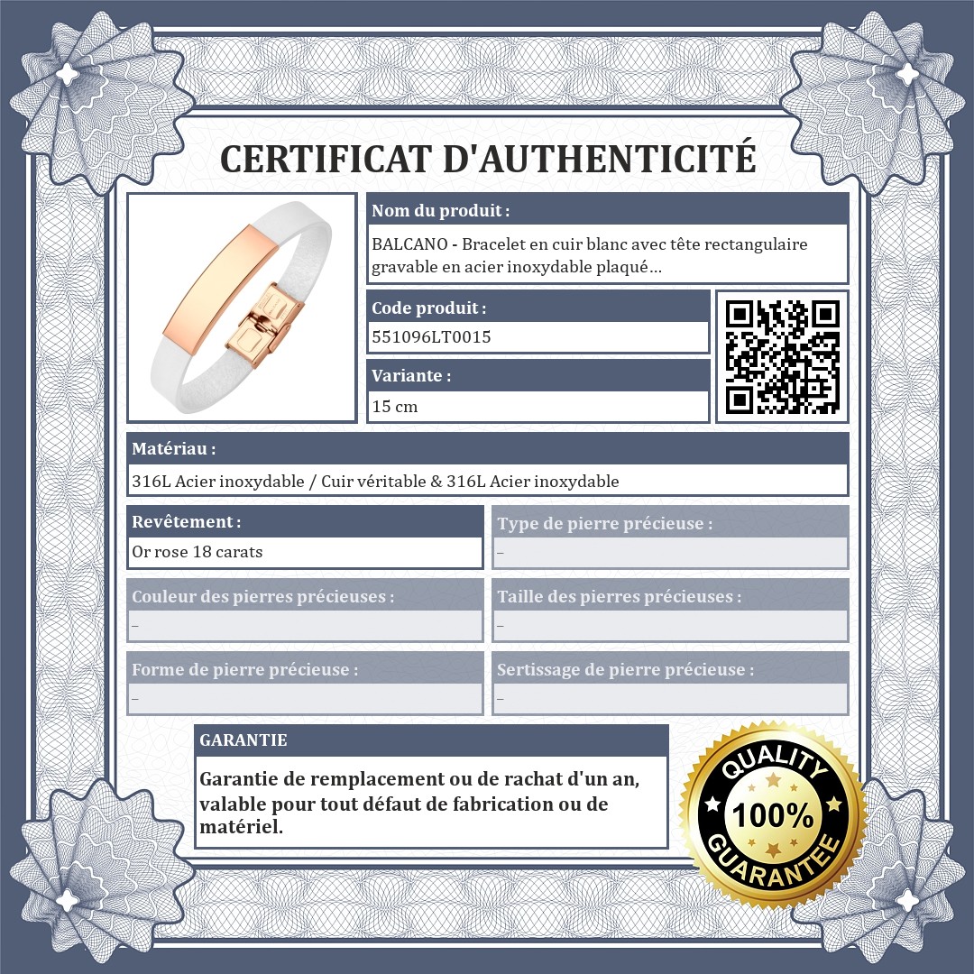 BALCANO - Bracelet en cuir blanc avec tête rectangulaire gravable en acier inoxydable plaqué or rose 18K