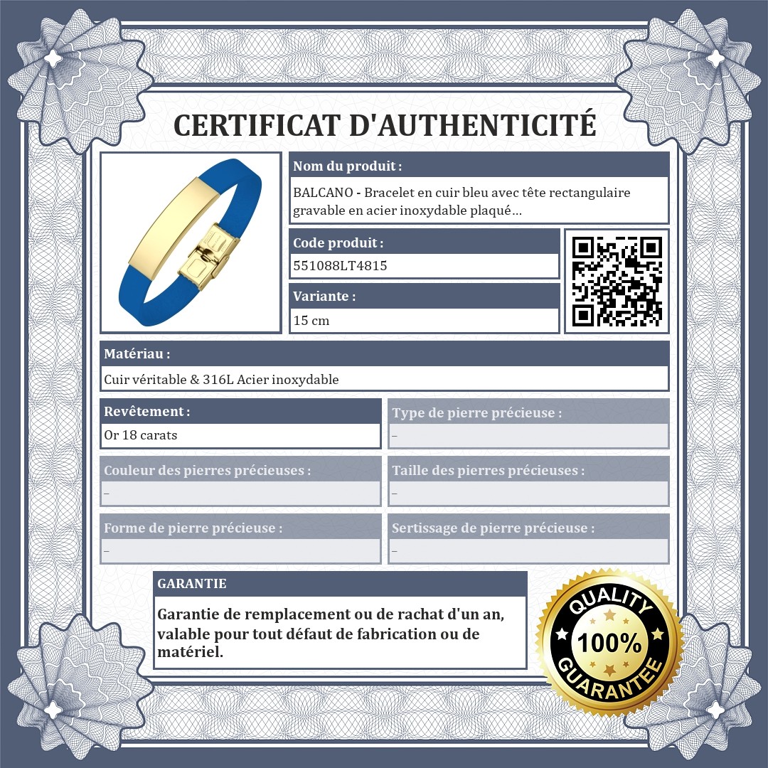 BALCANO - Bracelet en cuir bleu avec tête rectangulaire gravable en acier inoxydable plaqué or 18K