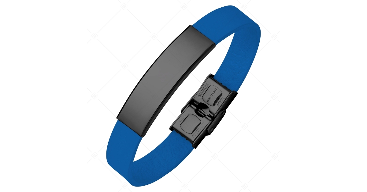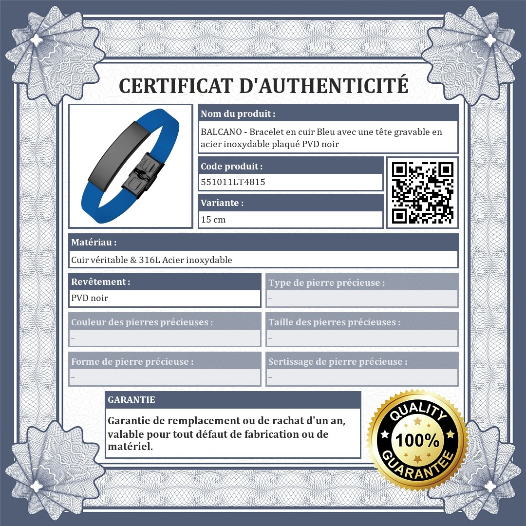 BALCANO - Bracelet en cuir Bleu avec une tête gravable en acier inoxydable plaqué PVD noir