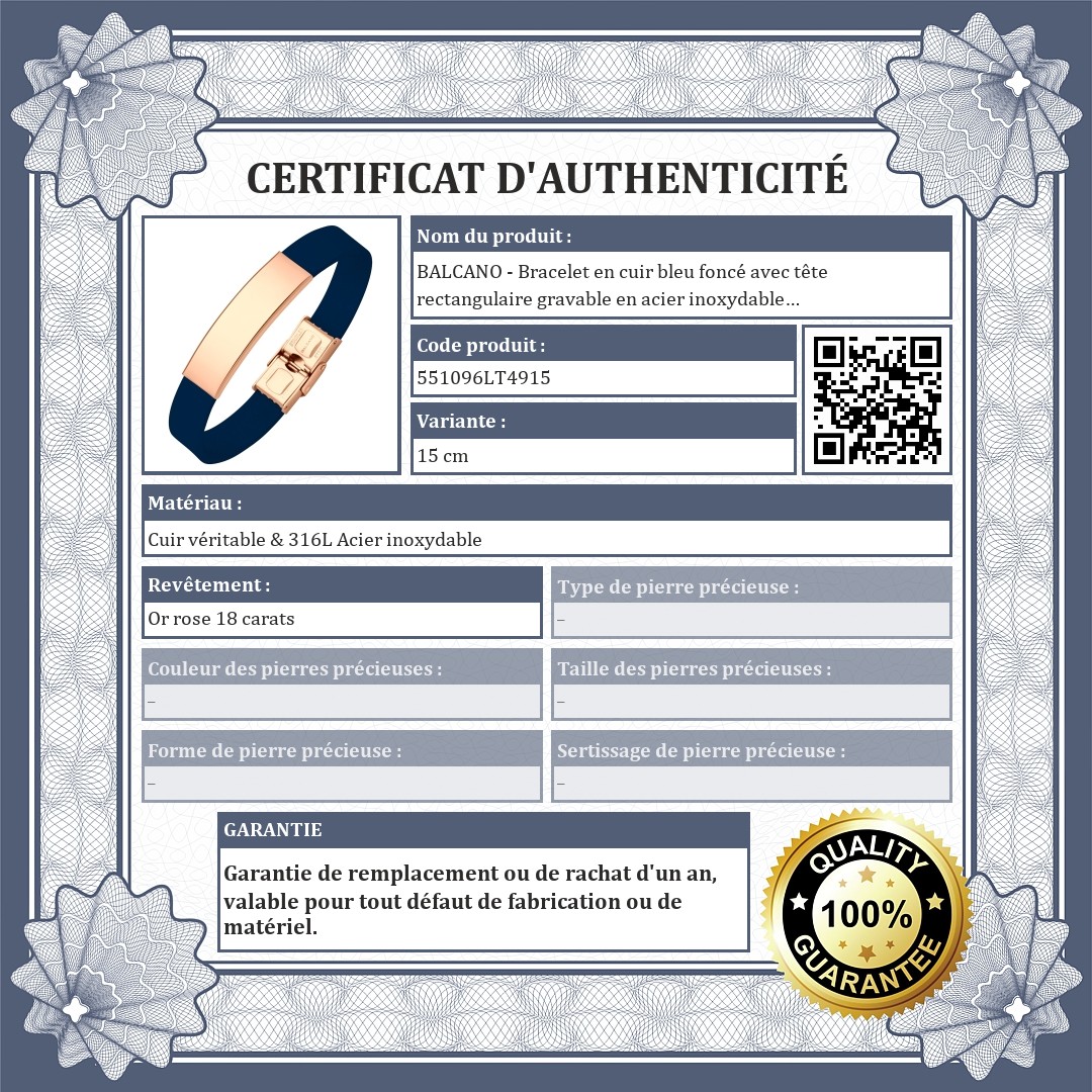 BALCANO - Bracelet en cuir bleu foncé avec tête rectangulaire gravable en acier inoxydable plaqué or rose 18K