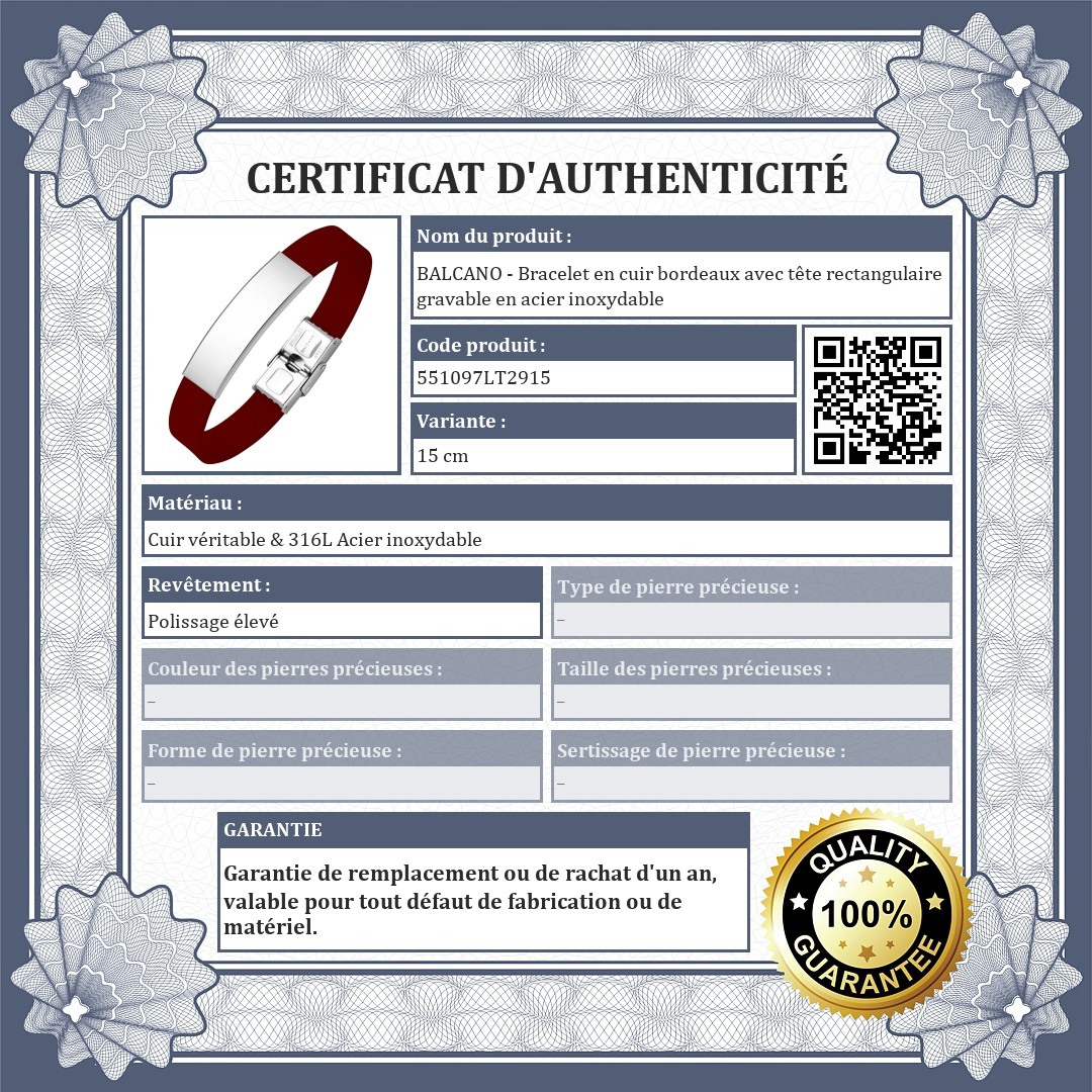 BALCANO - Bracelet en cuir bordeaux avec tête rectangulaire gravable en acier inoxydable