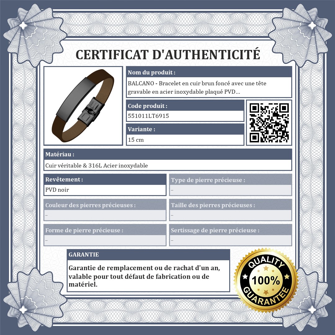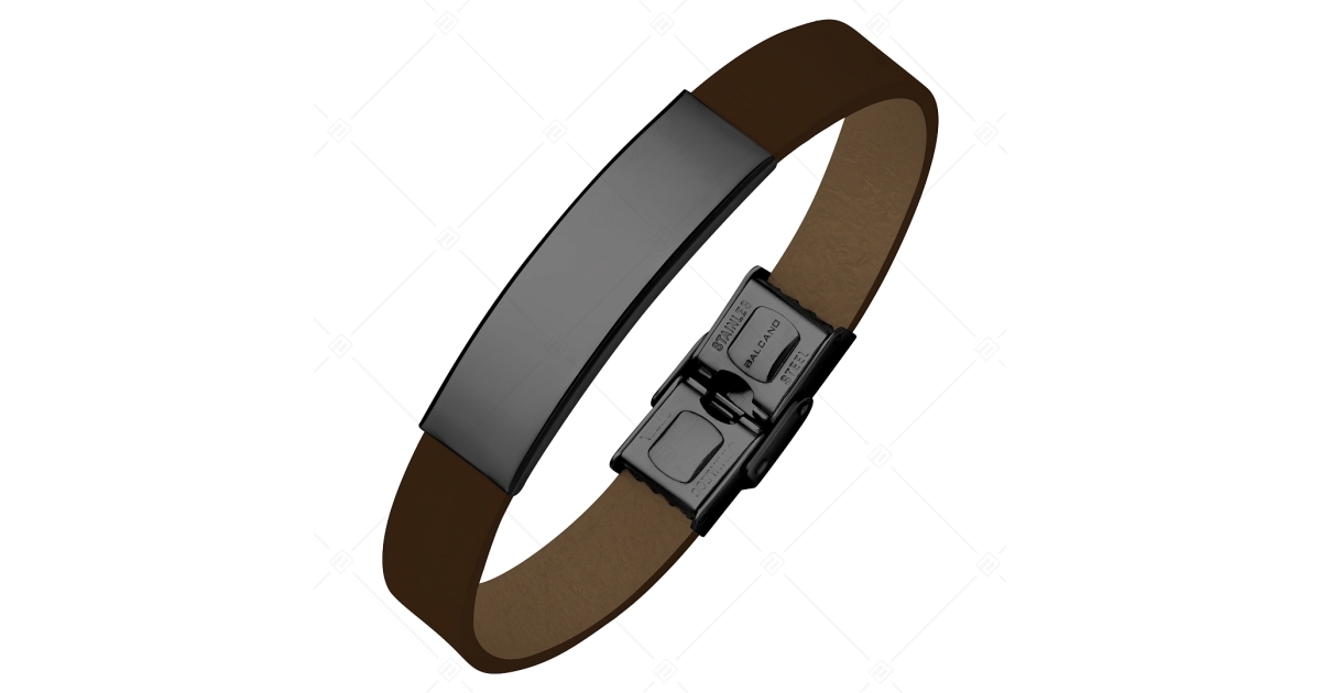 BALCANO - Bracelet en cuir brun foncé avec une tête gravable en acier inoxydable plaqué PVD noir