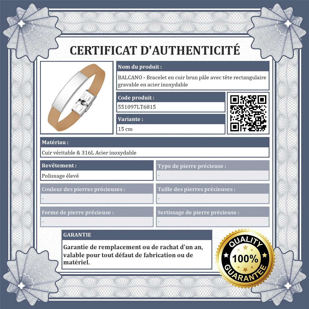 BALCANO - Bracelet en cuir brun pâle avec tête rectangulaire gravable en acier inoxydable